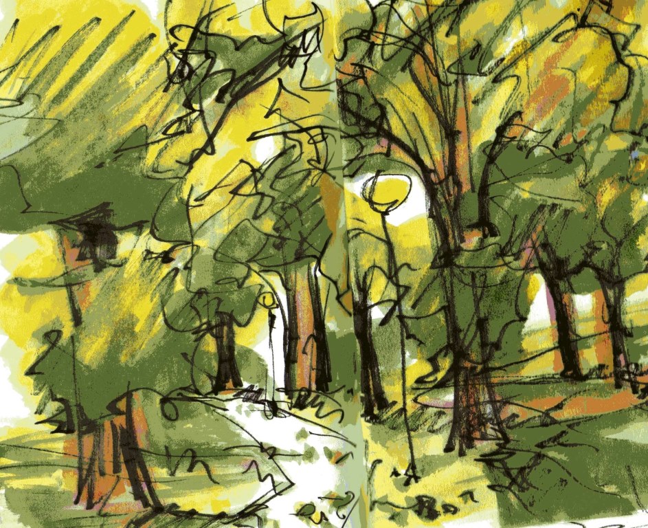 Desenho 4: o verde urbano protagonista e modernista de Olivais Norte, já com mais de 50 anos de idade dá escala, cor, movimento, carácter e interesse à imagem urbana deste excelente pequeno bairro lisboeta, tão bom de viver como de visitar, e agora facilmente a partir da estação de Metro da Encarnação, que abre bem no coração de Olivais Norte.