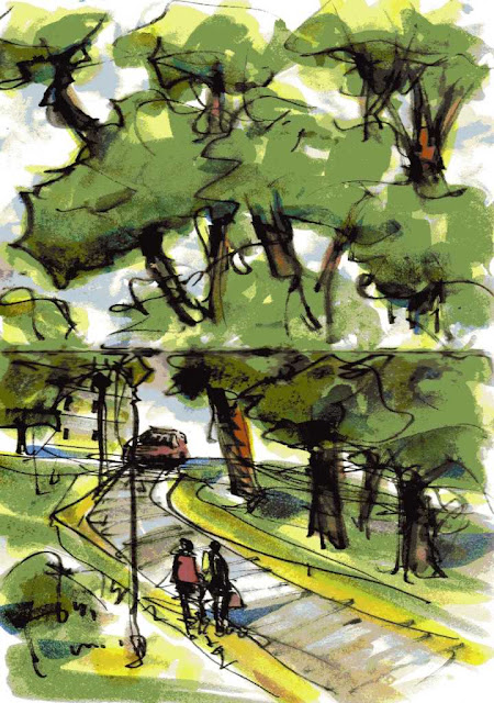 Desenho 6: o verde urbano faz "perdoar" muito aos edifícios com os quais se conjuga; o verde urbano é assim elemento fundamental em acções de requalificação de espaços de cidade.