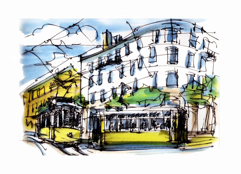 Desenho 5: este é o tema-base do excelente e modernista Olivais-Norte, a sempre renovada relação entre edifícios e árvores - renovada pelos pormenores e aspetos estruturantes que vamos sempre redescobrindo em cada esquisso e renovada também pelo próprio ciclo das estações; em termos de desenho já acima se referiu o excelente exercício de se procurar expressar a relação harmonizada entre formas construídas e naturais.