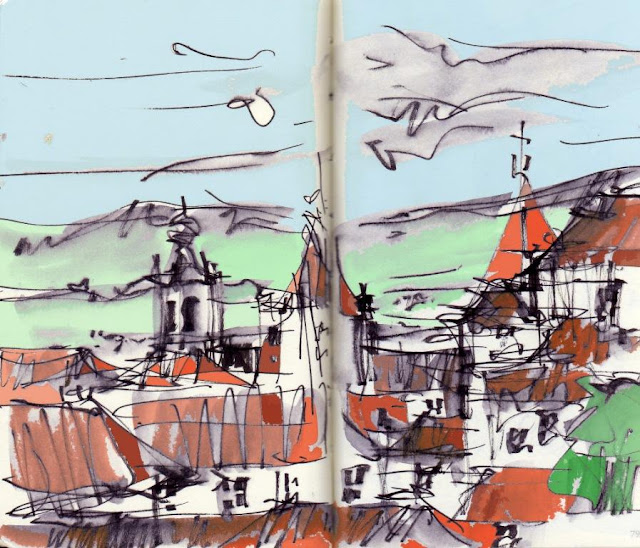 Desenho 2: Olivais Norte/Encarnação, em Lisboa é um bairro a conhecer - facilmente visitável a partir da estação de Metro da Encarnação (situada bem a meio do bairro) - onde arquitetura modernista, verde urbano bem escolhido e, essencialmente, um excelente modelo de "convívio" entre peões e veículos, são matérias bem evidenciadas/visíveis; em termos de prática de desenho trata-se aqui de um exercício de "azuis" - do céu às sombras - sendo que o verde natural surge em boa parte da mistura com o amarelo.